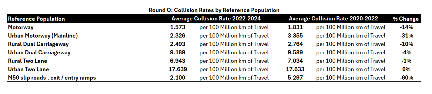 In order to capture the most current safety performance of national roads, TII make use of the data, as reported by AGS, current at the date of the analysis. This data is used to provide evidence for locations within the network where TII can target safety interventions. Any subsequent changes to this data should not affect this analysis.
